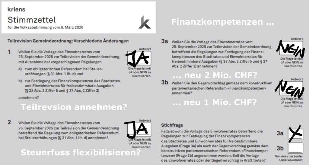 Durch diese Gegenvorschläge entsteht der obige komplizierter Abstimmungszettel, zu dem die SP Kriens 2× JA und 2× NEIN empfiehlt. Wir sagen JA zur Teilrevision der Gemeindeordnung undder Auslagerung der Bürgerrechtskommission. Wir sagen JA zur Flexibilisierung des Steuerfusses bis 1,9 Steuereinheiten, damit die heute sehr hohe Steuereinnahmen teilweise an die Bevölkerung zurückgegeben werden können. Fallen diese Einnahmen von den Unternehmen weg, bleibt mit der Flexibilisierung immer noch eineunkomplizierte Anpassung des Steuerfusses möglich. Zu den beidenSenkungen der Finanzkompetenzen sagen wir 2 x NEIN, da diese den administrativen Aufwand stark erhöhen würden. In der Stichfrage ist die Variante mit der Finanzkompetenz von 2 Millionen Franken anzukreuzen.