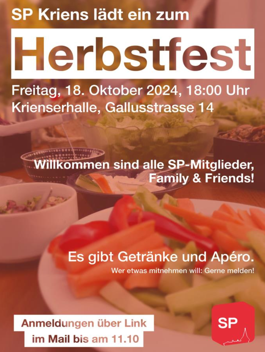 Das Wetter und die laufende Herbstsession in Bern machen deutlich, dass der Sommer auch schon wieder vorbei ist und der Herbst langsam Einzug hält. Wir möchten die Gelegenheit nutzen, Euch zu unserem ersten SP-Kriens Herbstfest einzuladen. Dieses findet am 18.10.2024 ab 18:00 Uhr in der Krienserhalle statt. Ihr findet alle wichtigen Informationen auf dem Flyer im Anhang.